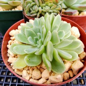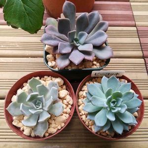 🔰購入品記録🔰 ダスティーローズ、ブルーエルフ、エケベリア属の不明さん 今日は、カインズで多肉を3個買いました🎶右下の多肉がエケベリア属としか記載がないのですが、肉厚で気に入りました🤗
