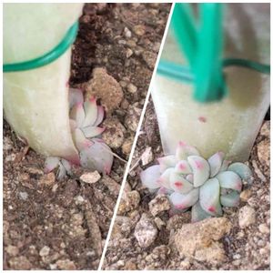 🔰購入品記録🔰 葉挿しの桃太郎。フリマ。 葉の表にも裏にもポコポコ桃太郎さんがついていました。両方生かすには垂直に立てるしかない!と思い、挿しましたが自立しないので支柱とビニールタイで固定。裏側は土に埋もれてしまいました💦出てきてね~😅