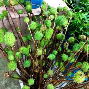 立ち枯れの雑草みたいになったトウゴマ。でも捨てるのは可哀想🤔 水やりを忘れて枯れたコニカルガムと合わせて店先のお飾りに···😆