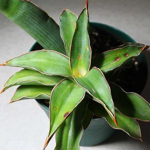 「サンスベリア ブルーキュー」 葉挿しから育った子株ですが傷だらけです 前々から分けたいと思いながら行動に移れません