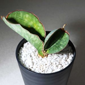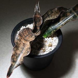 「サンスベリア ドラゴンウィング」 数年前に葉焼けで溶けた葉っぱを全て削除して 植え替えたらこんな形で成長が止まっています