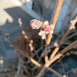 花桃の蕾からちょっとだけ花びらが覗き始めました。 こんな寒さの中植物は凄いなぁ〜。
