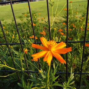 昨日の…花散歩 🚶🏼♀️🧡🚶🏼♀️🌿🚶🏼♀️🎶 キバナコスモスさん…フェンスからはみ出してました…🙆🏻♀️🤗😘🕺💃… 🏵️🏵️🏵️🏵️ 🌿🌿🌿🌿 青い芝生がきれいに…🌱💚💚💚💚 整備されてました…🕵️💚💚💚💚💚🌱