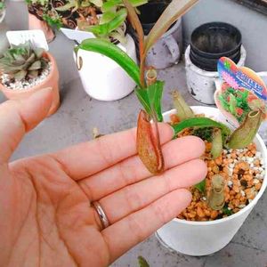 ネペンテス・ベントラータ 生長した脇芽です😃 少しずつ、ベントラータらしい形と色になってきてます。2cm弱と小さいけど、ちゃんと消化液が入ってますよ😁
