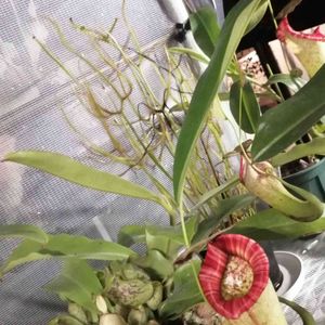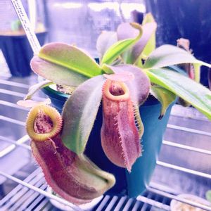 上がN.veitchii×edwardsiana 下がN.lowii キナバル 育ててこの2種だけ袋が膨らんでいる最中に蓋が小さくなっていって消失してしまうことがあります😓株が弱っているわけではなさそうだし薬もまいてます。なんででしょうかね不思議🤔