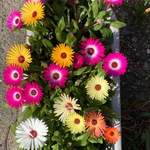 【リビングストンデージー】 太陽の申し子のような、原色のリビングストンデージーです。 花を見ると分かりますが、リトープスやコノフィツム、そしてマツバギクなどと同じ、メセンの仲間です😆 一年草なので、今年こそ種を採取して、蒔いてみたい!