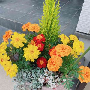 夏の寄せ植え、まず一つ目! ゴースドプレストやシルバーシーフは冬から繰り越し。奴に立つ子たちだな。 マリーゴールドが徐々にモリモリしてきて、いい感じ!!