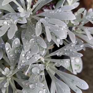寄せ植えに入れているモクビャッコウ シルバーリーフが綺麗🤍✨ 雨に濡れても なお素敵🤍✨ 来年になったら 大きな鉢に植え替えます😊