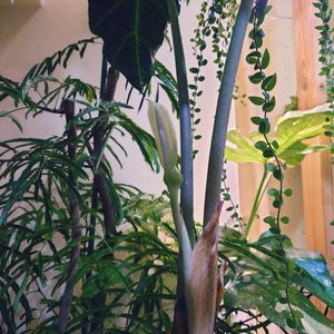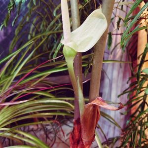 アローカシアの花だったみたいです。花が咲くのは珍しいとネットに書いてありました。自慢して良いですか?\(^o^)/