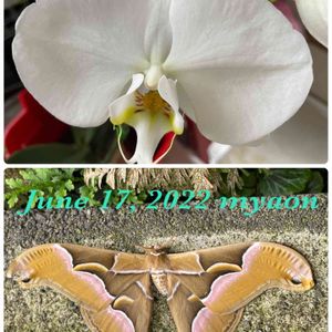 朝から苦手な方には申し訳なく思いますが、私的にあまりにも美しい姿だったので、ファレノプシス🟰 「蛾のような」といった意味を持つ胡蝶蘭と一緒に投稿する事をお許しください。 下段 シンジュサン“神樹蚕”“ミツキムシ” ヤママユガ科の一種。大きさは15~16cmぐらいあったかな。大きい蛾だったのでひぇ〜っと思いましたが、よーく見ると美しい姿でした。でもお触りは遠慮しておきます。娘の家の玄関脇、ブロックの上で撮影📸