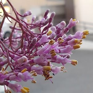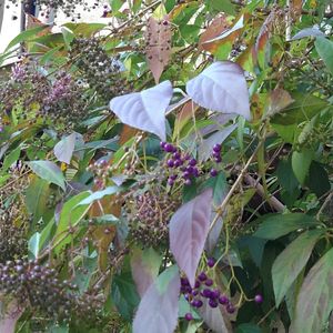 二度見をしてしまいました。 何とも味のある実と お花でした💜💚🎆 AIは カリカルパ・ボディニエリと 教えてくれました。 日本では咲かないとか。。