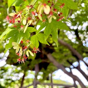 修善寺温泉の修禅寺 境内の青紅葉に真っ赤な花が咲いて プロペラを付けた種がたくさん 鐘つき童をバックに ゴォ〜ン