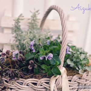 おはようございます^ ^ 昨日作った籠寄せ💜🩵🍃 ビオラ藍月 サントリナ シルバーミラー クローバー ディコンドラ を籠に寄せました🧺 藍月は下を向いて咲くので撮るのが難しい😅 でも俯き咲き、好きです♡ 大好きな色合いの籠寄せです💕