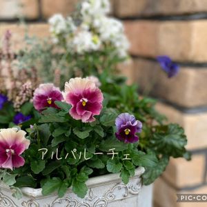 こんにちは^ ^ ①シクラメンの寄せ植え🤍🍃 復活しなかったアリッサムのところにディコンドラを植えました🍃 困った時のディコンドラ、殆どの寄せ植えに使えます👍😄 ⓶⓷パンジー アルパルーチェ♡ 紫で咲いたお花がピンクになってきました💜🩷 これからみんなと同じ色になるのかな🤗💓