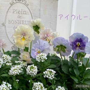 おはようございます^ ^ ビオラ アイクルールを植え替えました🤗 白いアリッサムの3株の小さな寄せ植えにしました。 パステルカラーになってとっても可愛い🥰