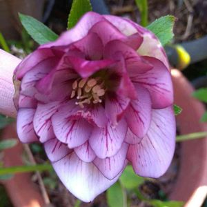 「クリスマスローズ」 ピンク色のダブルが咲きました(種から) 花弁に細かな線が全体を引き立てている🌼