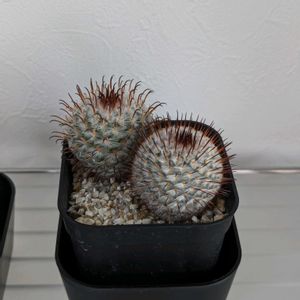 少し前にホームセンターで手に入れたマミラリア属2鉢です✨️ ①紫丸 小さいけどトゲ痛い😆 ②姫春星 子株のバランスが絶妙☁️