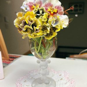 庭のビオラを切り戻し 部屋に飾りました🥰 断捨離中に見つけた💡 十数年前にディズニーランドで 購入したワイン🍷グラスを 花瓶にしてパフェ風に 飾ってみました🥰 かわいい🩷自己満足🤭