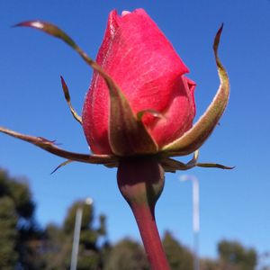 青空に「バラ」の真っ赤な蕾が映えます。どんな花になるのか楽しみです。💙🌷😊😄🤗🌞