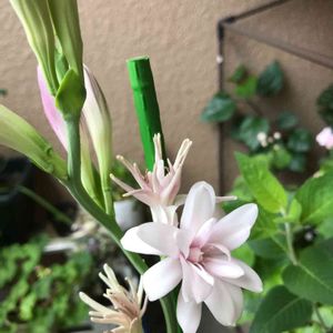 こんにちは😃💐💐 今日、雨が降る前に撮りました😊😃♡ 去年は一本だったのに今年は6本も出て綺麗に咲いて、素敵な香りを漂わせています。 (((o(*゚▽゚*)o)))♡♡🤍💚🤍💚🤍💚 🏷️ 白い貴婦人✨ 🏷️ 白い恋人たち ◎ チュベローズ 和名 : 月下香 科名 : キジカクシ科(リュウゼツラン科) 属名 : ゲッカコウ属 チューベローズは地表から真直ぐに葉茎を直立させ、そのなかから伸ばした花茎に縦に連ねるように白い花を咲かせます。 花には一重から八重咲きまであり、ピンク色の花を咲かせる品種もあります。 夜になると芳香を放つ特徴から「夜来香(イエライシャン)」という別名を持ちます。 チューベローズの香りは甘く濃厚で、香水の原料としても利用されています。 暑い中でも綺麗に咲いています🥰👍 ザーと来てた雨が止みました☂️ 台風6号🌀🌀が沖縄など大きな被害が出ていますね😂お見舞い申し上げますm(_ _*)m 今週は静岡県も台風🌀の影響で大雨に警戒してくださいとの事です🙇♂️ 気をつけてお過ごしくださいね。 ʕ•̫͡•ʕ•̫͡•ʔ•̫͡•ʔ•̫͡•ʕ•̫͡•ʔ•̫͡•ʕ•̫͡•ʕ•̫͡•ʔ•̫͡•ʔ•̫͡•ʕ•̫͡•ʔ•̫͡•ʔ