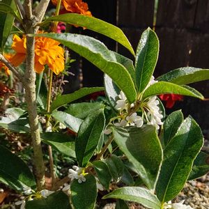 キンモクセイの白です。 近くに寄らないと香りがしないそうで、確かに近所でキンモクセイの香りがしてるのに、うちはまだ小さいから香りがしないんだと思ってたら、それが普通だったのね(´- `*) 写真撮りながらでも背中にあるバジルのほうが香りがプンプンしてました( =^ω^)