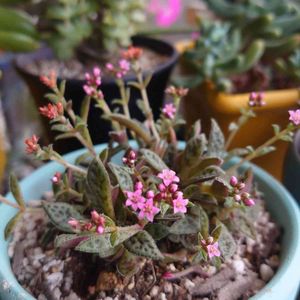 クラッスラ属クーペリー🌸 小さくてかわいい花が いっぱい咲いてくれる❣️ 水色の鉢は華友さんからの ステキ便✨☀️✨