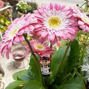 ペコちゃん祭りに…😁 ペコちゃんにも負けない位の可愛いさのガーベラ🥰🥰🥰 気づけば…私のお庭ピンク多めの花ばかり…😆 決して、ぶりっ子ではありません🤣🤣🤣(もう、死語かしら⁉️😕)