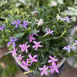 おはようございます😺 見つけてしまうと作ってしまう『イソトマ』だけの寄せ植え🪴✨✨ 今年も色違いで作りました🤗💜🤍🩷 一つずつのお名前も可愛い😍 『清花』『駿花』『桃花』『優花』