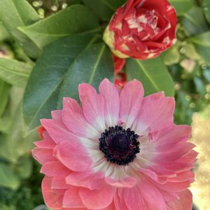 赤い椿さんとピンクのアネモネさん 並んで写ってもらいました😊 白いアネモネさんだったら良かったかなぁ〜なんて思ってそうなピンクのアネモネさん!