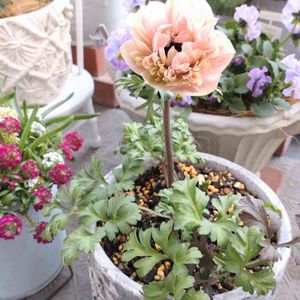 <アネモネ ダブル ピーチ> <プリムラ><ビオラ> アネモネさん😅また変化。 初めての濃いピンク色ではないこが2輪目にミックスで咲き→花びらの形状をかえて色まで変化。。夜眠る度に変化してるよう…よく咲くアネモネはよく変わるアネモネみたいです。 この色も可愛くて好き💕 ※1/19→1本目 2/14→2本目 今日のは2本目の色変化です🌼