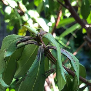 沈丁花〜その後〜 枝先の新芽の辺りから黒ずんでいる葉も見られるようになりました。 でも、そんな中…〈次の画像〉 *何かアドバイスをいただけるとありがたいです。
