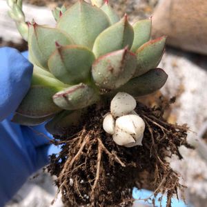 植え替えをしていたら、根元に真っ白なものを発見しました。 茎についてるようなのですが、これって何ですか? エケベリア ツルギダです。