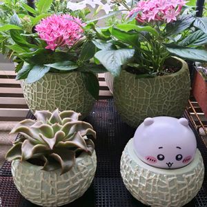 おはようございます ☀️ 🍈めろん畑 😄 カミさんが小さな、めろん鉢を2つ 作ってくれました 😀🍈🍈 🪷ゴールドバー マディバ?夏に赤く なるみたいですが発根管理中です もう一つは室内に置きたいので 何か良いのないか探索中なので とりあえず、ちいかわ植えてみた😉 🌟後ろの大めろんは2色のペンタスです