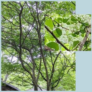 昨日池の端の咲き始めているサワフタギを投稿しましたが こちらは庭の奥の親木で 6、7mに育っています 今朝見上げると一部にお花が咲いていました でも少ないみたい 昨年は白いふわふわのお花が沢山咲いて青い実も沢山出来ましたが 今年はこの程度なのかしら…? 今雨が降り出して来ました… 🇺🇦🙏💧