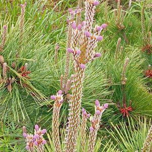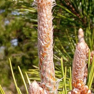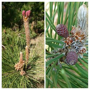 昨日のあなたはだ〜れ?その1の答 黒松(雌花)です。🤗 今年伸びた新芽の先に赤い小さな松ぼっくりの赤ちゃん(雌花)がついています。🤗🎵 左側は雄花ですが上がつぼみ下が花粉放出中 まるでつくしの頭が無数についているようです。🤗🎵💕 手でさわると煙のように花粉が飛びます。🤗🎵
