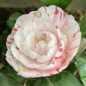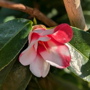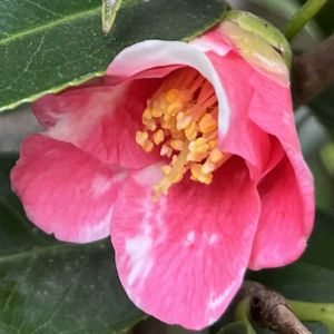 おはようございます😃 今にも降り出しそうな暖かな朝です。 昨日、春のような陽気に誘われて、お隣、東浦町於大公園に出かけました。 お目当ては椿の花、見つけました。 極小の侘助椿、胡蝶侘助がポツポツと咲き始めました。 紅白の愛らしい花です。 小さなために、葉蔭に隠れて見落としてしまいます。 だから、葉っぱの間を覗き込んでいる私を訝しげに見ながら通り過ぎる人がいます。😅 花付きのいい紅侘助に比べると、花数も少ないので、こんなに美しい花も立ち止まって見る人はほとんどいません。 紅白のコントラストが強いのが特徴ですが、今はまだ淡い色合いです。 しばらくしたら、また見に行ってみます。😊