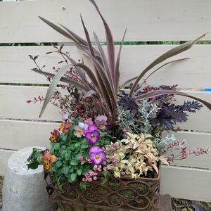 ニューサイランをメインに🌿 通年楽しめる寄せ植え作りました♩ ・ニューサイラン ピンクストライプ ・ロフォミルタス リトルスター ・コプロスマ ブロックケイ ・オレアリア リトルスモーキー ・セイヨウイワナンテン フロマージュ ・へデラ 雪の妖精 ・スイーツMIXビオラ パティシエ👨🍳の気まぐれドルチェ🧁 右奥の銅葉のケールみたいなリーフはゲブラさんのオリジナル。店の方に食べれるんだよ〜と教えてもらいました!店頭で寄せ植えに使われていたのが素敵で購入😂 もう少し大きくなったらバランス良くなるかな♪ ビオラが終わったら他のお花にチェンジして手間なしにしたつもりです笑