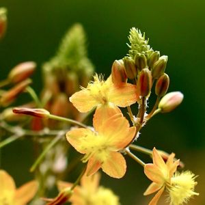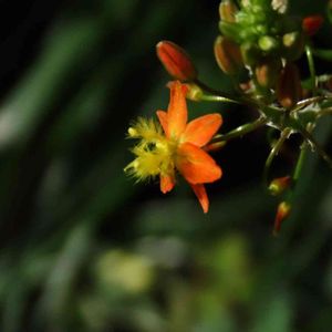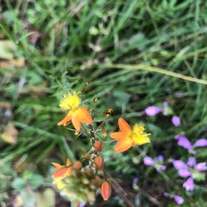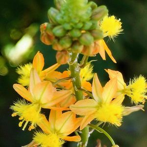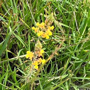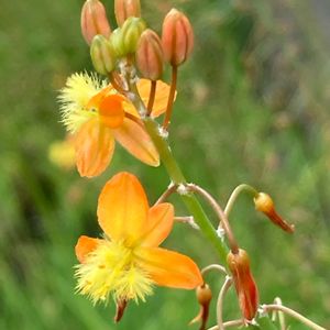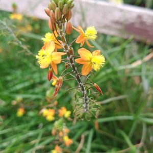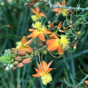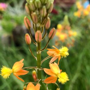 【ハナアロエ(ブルビネ)】 南アフリカ原産、ツルボラン科多年草 葉は青みがかった緑色で肉厚で棒状になる。 葉の間から花茎を長く伸ばして花序を出し、花径1㎝程度の小さな花を総状に咲かせる。 花は6枚の花弁を持つ星形で、雄しべには細かい毛が密生する。 一日花で、長い花期の間に次々と開花する。 アロエのように多肉質な葉を持ち、オレンジ色の花を咲かせることから「ハナアロエ」の名前が付いたとされる。 草丈:25㎝~60㎝ 花色:オレンジ、黄色 花期:4月~11月 ときわ公園@宇部市