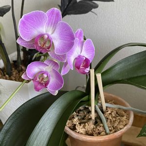 去年モニターで頂いたミディ胡蝶蘭、3つだけですが咲きました🌸 ちょっと傾いてたから割り箸で補正してたの、外してから撮れば良かった😅