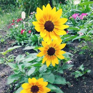 お隣の庭が段々お花畑🌷🌹🌻🌼になってます*˙︶˙*)ノ" このひまわりは背が低いから可愛いわぁ🌻🌻🌻🌻