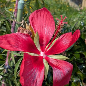 モミジアオイ アオイ科フヨウ属 多年草 別名は紅蜀葵(こうしょっき) 和名のモミジアオイは、葉がモミジのような形であることから付いた。 北米原産 高さ1.5〜2m。 葉は長さ10〜20cmで、掌状に3〜5裂し、裂片の幅は狭い。 花は径15〜20cmで、ハイビスカスのような花を咲かせる。 花弁は5個で平開し、花弁と花弁の間に隙間がある。 雄しべは多数つき、雌しべと雄しべの基部は合着して長い柱状となり、ブラシ状に雄しべが出て、その先に柱頭5個が突き出る。 一日花である。 花期7〜9月 花言葉は「箱入り娘」 🏷️真っ赤な火曜日 に参加させていただきます。