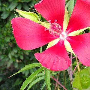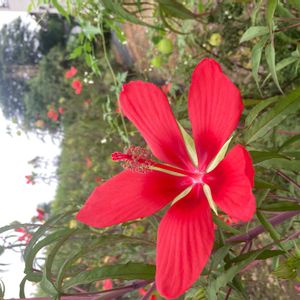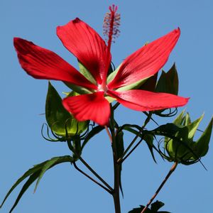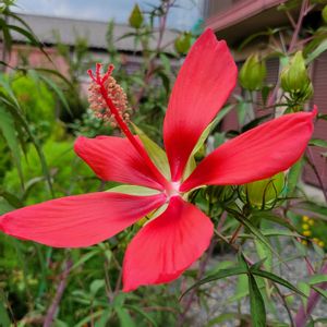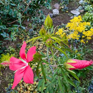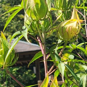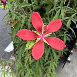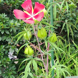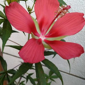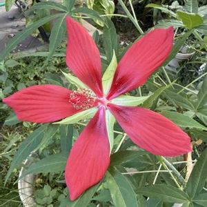 モミジアオイ 名前の由来は葉がモミジの葉に似てるから🍁 宿根草 花は1日だけ。 丈は145cm(母宅は2m超え)、花の直径は18cm 先週から1つまたは2つ、毎日のように咲いてくれてます😊 花が終わると茎は秋に枯れて(カットしました)春には土から新しい芽が出てきます。 赤い花は茎や葉が赤っぽいです🌱 とても丈夫で西日ガンガンでも元気なので、今年白花の苗も購入しました🎶