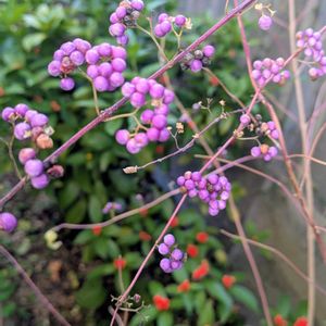 今日のお花 コムラサキ シソ科 ムラサキシキブ属 お庭に勝手に生えたコムラサキです 今は葉が落ちて紫色の果実だけになっています 2~3枚目 7/18撮影した花 4枚目 8/8撮影 緑色から紫色に色づいています 5枚目 11/28撮影 コムラサキの足もとのセンリョウの赤い果実