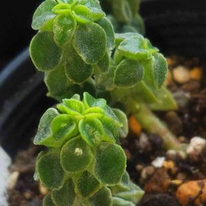 コショウ科ペペロミア属 コルメラ(極小種) Peperomia columella 🍀茎がまっすぐに伸びる直立タイプ、茎の長さは10cmほど、4~5mmの矢じり型で多肉質の小さい葉っぱをたくさんつけるので、多肉植物としても扱われる。 多肉質の葉は水が不足すると縮んでしまうので水は切らしすぎない。肉厚葉の表面は、よく見ると透き通っている。数珠のような葉っぱが連なっている姿がとても個性的で面白い。