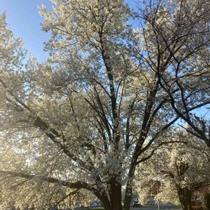 マメナシの木です。一見桜に見えますがお花は真っ白でとっても綺麗です。これが咲き始めると私の花粉症も始まり春が来た実感がします😆
