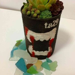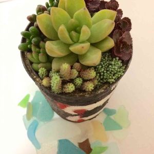 こんばんは〜〜❣️ aoちゃんに貰った多肉ちゃん✨オウレイさんを自作の出血歯のリメ缶に寄せ植え😆💕 さなぼてんちゃんに貰ったシーグラスと一緒に撮ったょ( ´͈ ᗨ `͈ )◞♡⃛