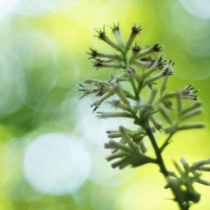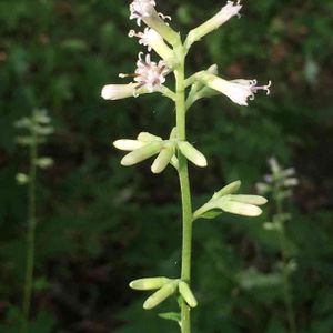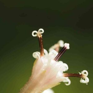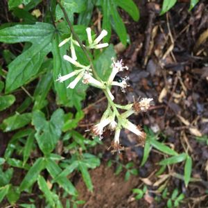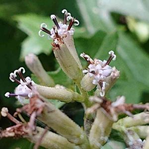 そのモミジガサの花。 コウモリソウ属共通の形ですね😊 花筒の中には小花が5個、柱頭の先端が2裂してクルリと反り返ります。 花の先の方はすぐに茶色くなります。