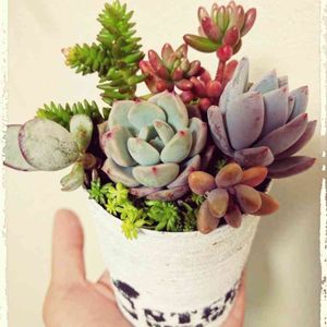 人生で初めて作ったリメ缶に寄せ植え。 霜の朝を何回も落っことして粉がはげはげ⤵ それに根っこあるのとないのが混ざってるけど大丈夫かな💦