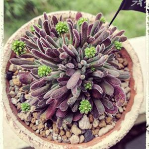 クラッスラで一番好きなプベスケンス♡ 紫と緑の色合いがなんともいえん🎶 しかし、私ってニコちゃん鉢いったいいくつ持ってるんだろうか😁