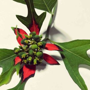 こう見えてユーフォルビアの仲間のようです 先月投稿したときより ポインセチアっぽく鮮やか❤️カボチャみたいな種?いっぱいぶら下げてます 種 どこに蒔こうかな🎶